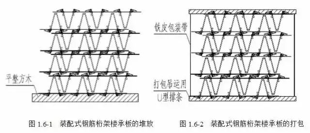 1、钢筋桁架楼承板应遵循相同规格同垛堆放的原则。堆放时两块板正反倒扣为一组,堆放在平整方木上,如图1.6-1所示。